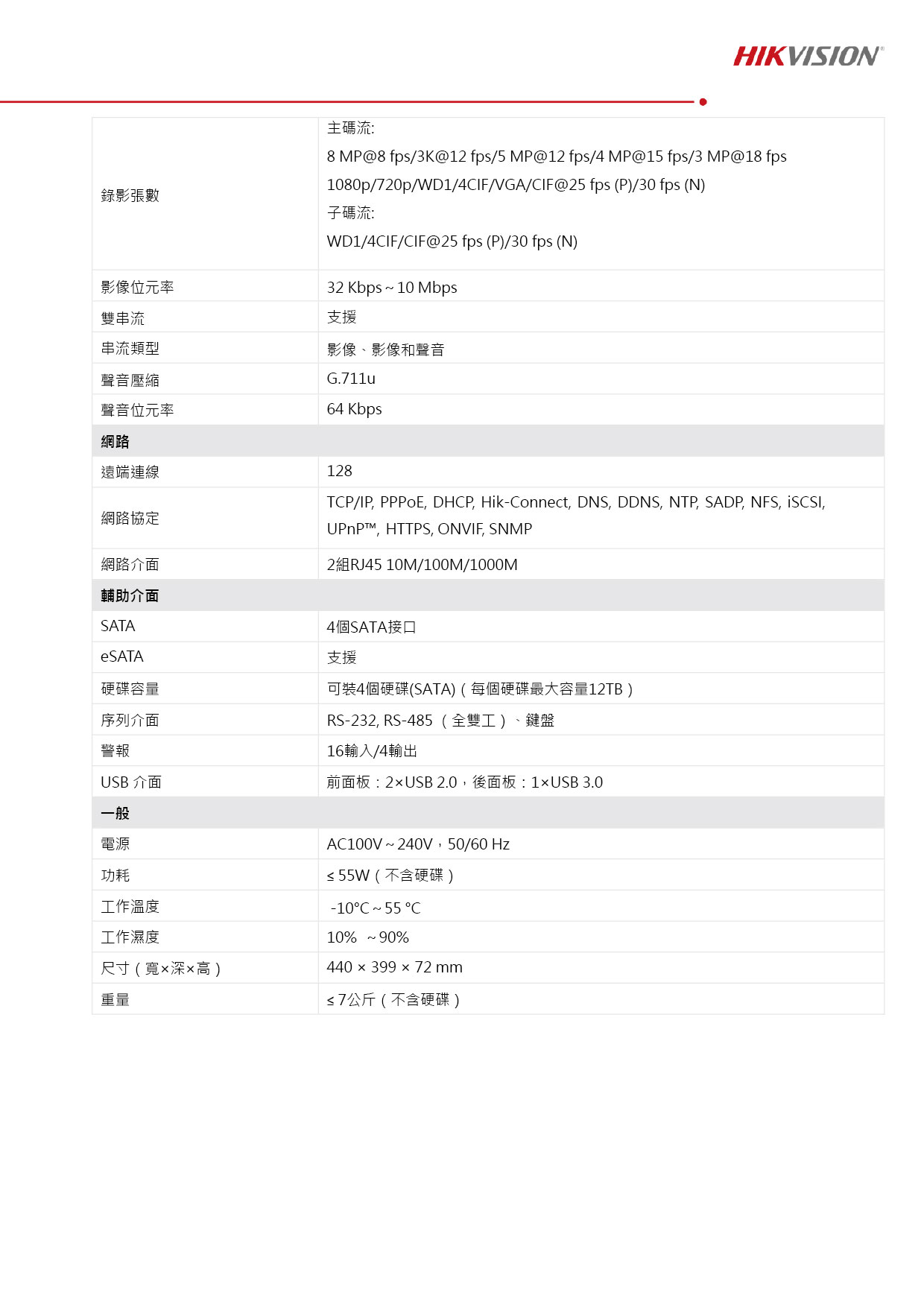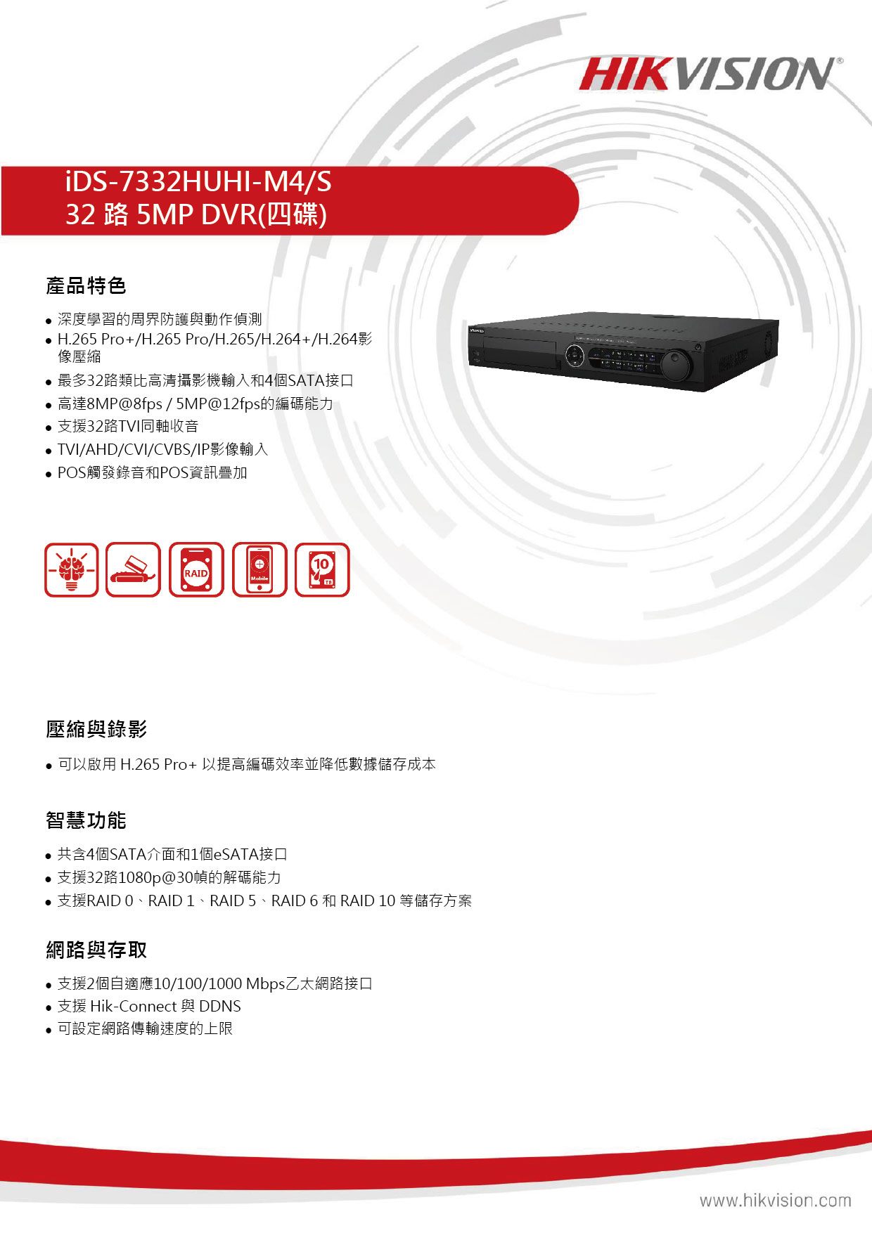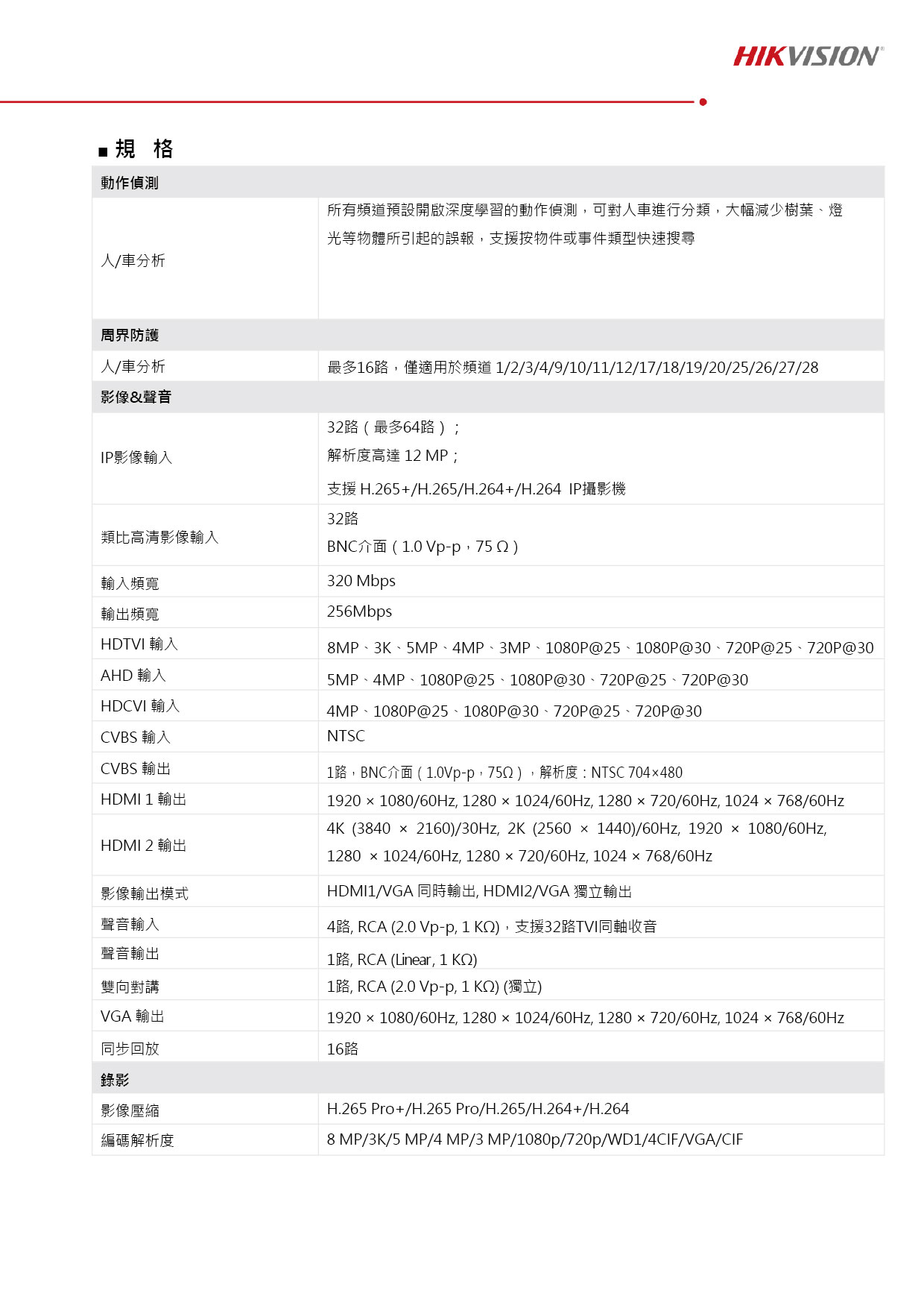 32路(最多64路)解析度高達12MP,支援 H.265+/H.265/H.264+/H.264 IP攝影機 |